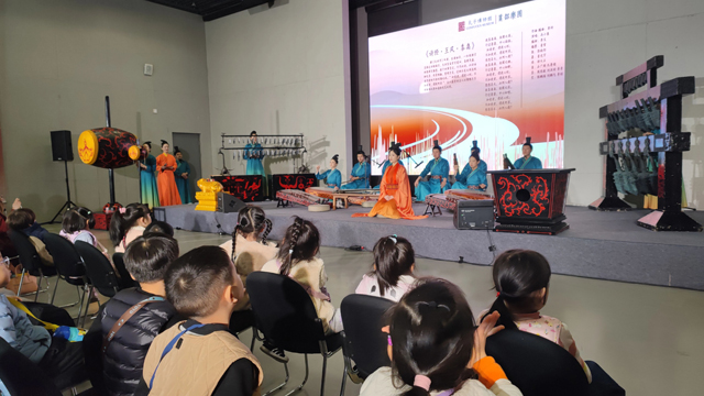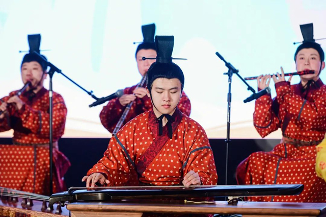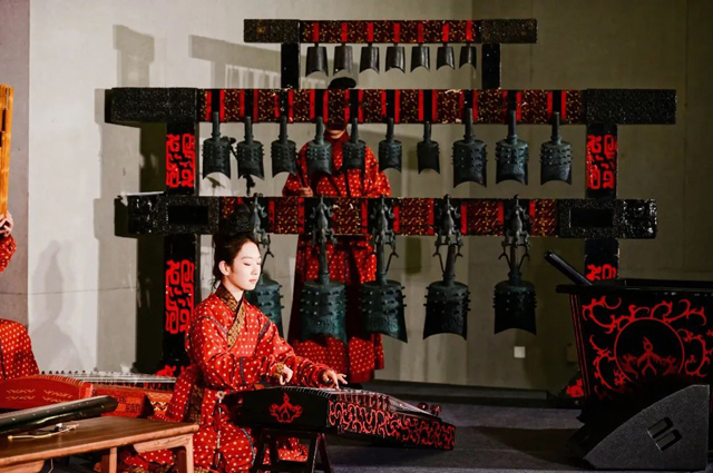 此外,孔子博物館的簫韶樂團(tuán)圍繞“禮、樂、歌、舞”多途徑探索,對(duì)傳世古曲進(jìn)行了二次編排復(fù)原。其中,鐘、磬、琴、瑟、篪等各類樂器數(shù)十件,皆是以出土樂器文物為參照復(fù)原而來。此次演出了《詩(shī)經(jīng)?小雅?鹿鳴》《妝臺(tái)秋思》《鳳求凰》《春江花月夜》等曲目,并在現(xiàn)場(chǎng)展示了古禮四佾舞。