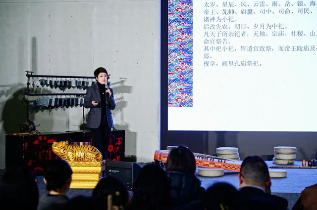 開幕式當(dāng)晚,國(guó)絲還舉辦了“禮樂之夜”活動(dòng)。孔子博物館舊藏服飾研究中心主任徐冉帶來《齊明盛服以承祭祀》主題分享,通過對(duì)明代衍圣公祭服的解讀,剖析明代服飾在禮儀文化中的重要作用??鬃硬┪镳^典藏部主任褚紅軒為觀眾帶來了《畢誠(chéng)畢敬-談孔子博物館藏清代獸面紋掐絲琺瑯五供》主題分享,讓觀眾對(duì)“五供”的歷史源流與特點(diǎn)有更深入的了解。