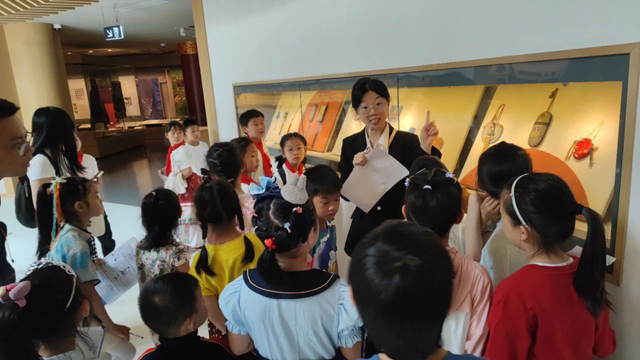 領(lǐng)取了任務(wù)卡的孩子們興致勃勃地出發(fā)啦!在講解員的帶領(lǐng)下,參觀”錦程——中國絲綢與絲綢之路“展廳的小朋友們一邊認真聽講一邊仔細答題,在一件件絲綢文物上尋覓動物的身影,了解藏品的名稱。