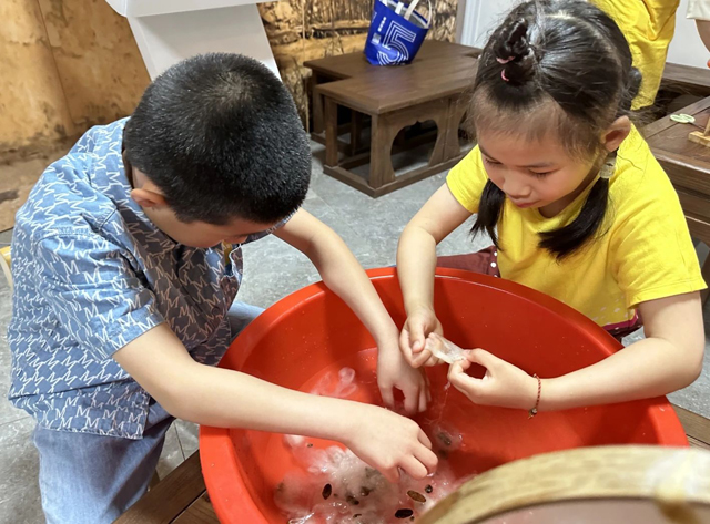 接著孩子們又來到了兒童館,學(xué)習(xí)繅絲和剝綿兜的技藝,體驗兒童館投壺和射箭等傳統(tǒng)游戲,進行闖關(guān)。
