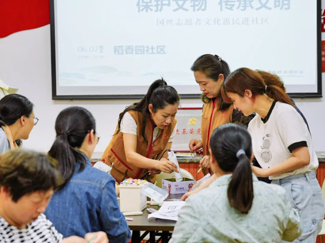 6月7日下午,國絲志愿者到拱墅區(qū)稻香園社區(qū),開展了一次別開生面的科普活動。志愿者以“漢機(jī)織漢錦”、“趙伯澐墓絲綢文物應(yīng)急保護(hù)和研究”兩個(gè)項(xiàng)目為代表,介紹了國絲紡織品文物保護(hù)技術(shù)。同時(shí),志愿者教大家用宋代絲綢紋樣制作鑰匙扣、徽章等有趣的小物件。
