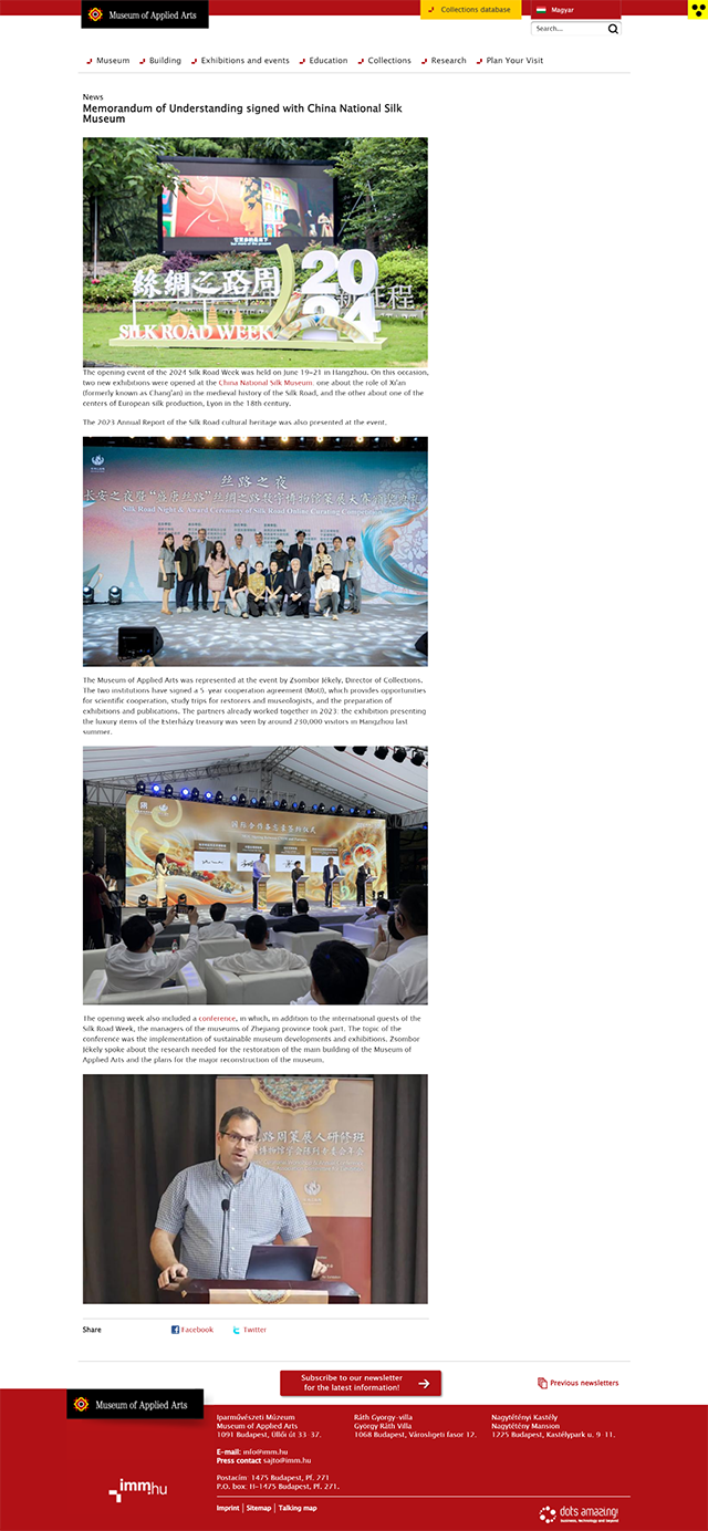 2024年6月19日至6月21日,匈牙利應(yīng)用藝術(shù)博物館副館長卓思博·葉克利博士出席了在杭州舉辦的2024“絲綢之路周”主場活動(dòng),并作為館方代表與中國絲綢博物館簽署了一項(xiàng)為期五年的合作協(xié)議(MOU)。雙方將基于平等互利的原則,在展覽、館藏、保護(hù)、研究、出版和教育等領(lǐng)域開展廣泛的文化交流與合作。葉克利博士還在絲綢之路周策展人研修班暨浙江省博物館學(xué)會(huì)陳列專委會(huì)年會(huì)上作了題為《多瑙河地區(qū)新藝術(shù)遺產(chǎn)的可持續(xù)修復(fù):以匈牙利應(yīng)用藝術(shù)博物館的發(fā)展項(xiàng)目為例》的報(bào)告。報(bào)告詳細(xì)闡述了匈牙利應(yīng)用藝術(shù)博物館在新藝術(shù)遺產(chǎn)保護(hù)和可持續(xù)修復(fù)方面的研究和實(shí)踐,展示了該博物館在文化遺產(chǎn)保護(hù)領(lǐng)域的創(chuàng)新成果和未來發(fā)展計(jì)劃。同時(shí),匈牙利應(yīng)用藝術(shù)博物館也在官網(wǎng)上對(duì)本次“絲綢之路周”活動(dòng)進(jìn)行了專題報(bào)道。