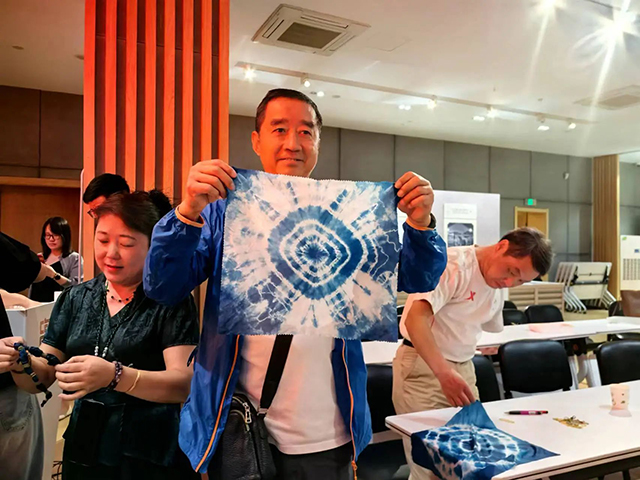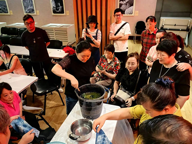 國絲手工課王冰冰老師提前準備好扎染手工制作材料,大家在了解扎染的歷史背景、藝術特點和制作工藝后,躍躍欲試,期待自己的作品。一疊、二綁、三染,顏色在布料上相互交織、滲透,一幅幅作品在大家的手中緩緩展開,現(xiàn)場氛圍溫馨熱鬧。當傳承遇上體驗,扎染帶來了不一樣的體驗,也激發(fā)了大家對中國傳統(tǒng)文化的興趣。
