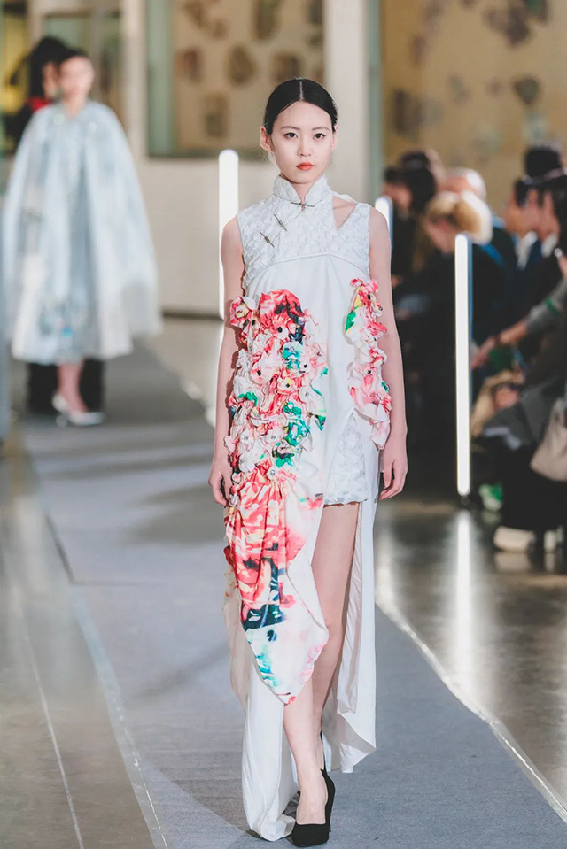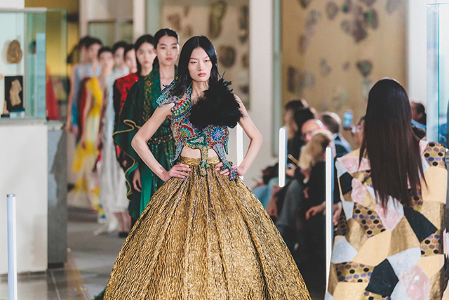 本次發(fā)布會(huì)以反映絲綢之路文化交流與融合的中國(guó)絲綢博物館藏唐代翼馬紋錦和立獅寶花紋錦等文物為創(chuàng)作素材,邀請(qǐng)中法設(shè)計(jì)師進(jìn)行聯(lián)合設(shè)計(jì),將千年絲路文化遺產(chǎn)與現(xiàn)代時(shí)尚設(shè)計(jì)完美結(jié)合,最終由浙江理工大學(xué)時(shí)裝表演團(tuán)隊(duì)完成展演。