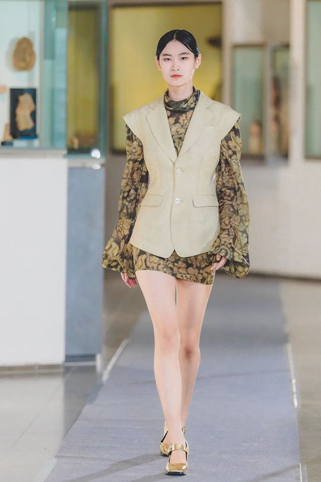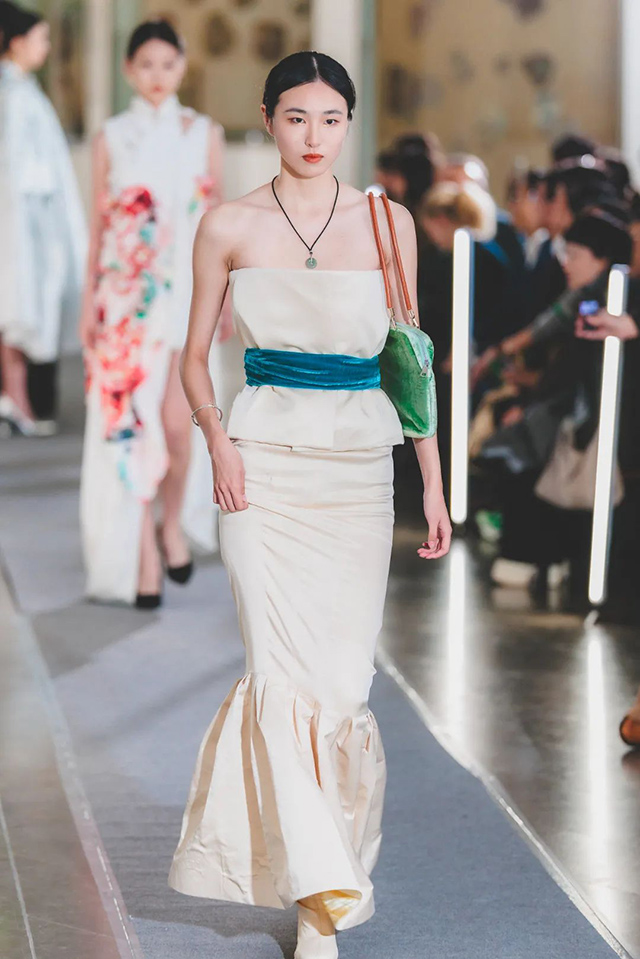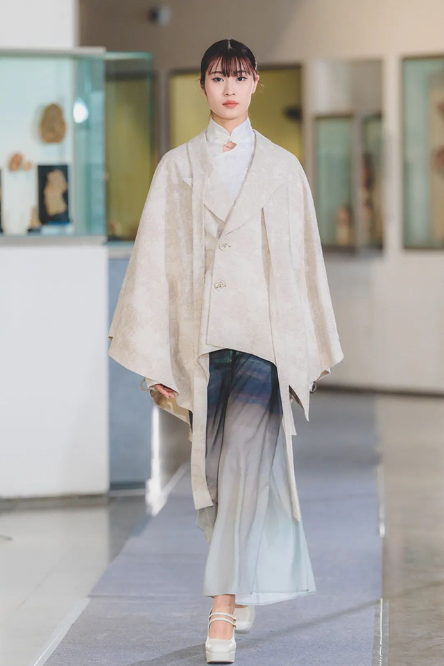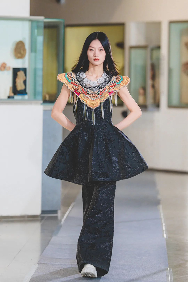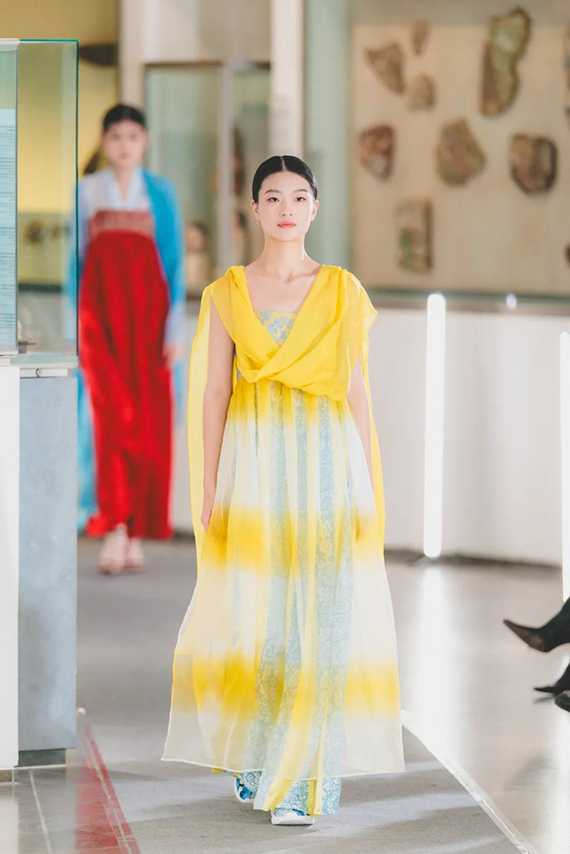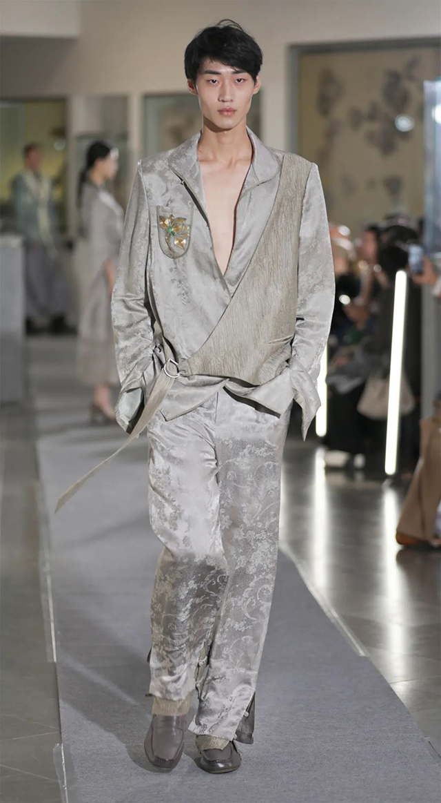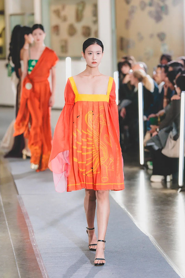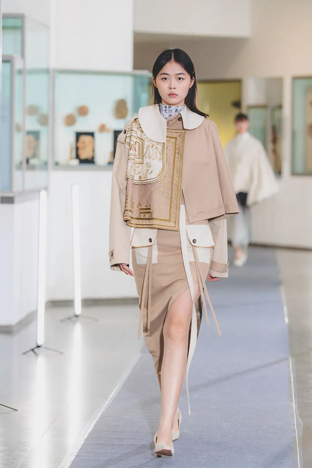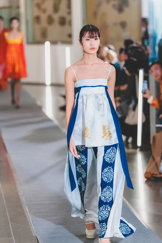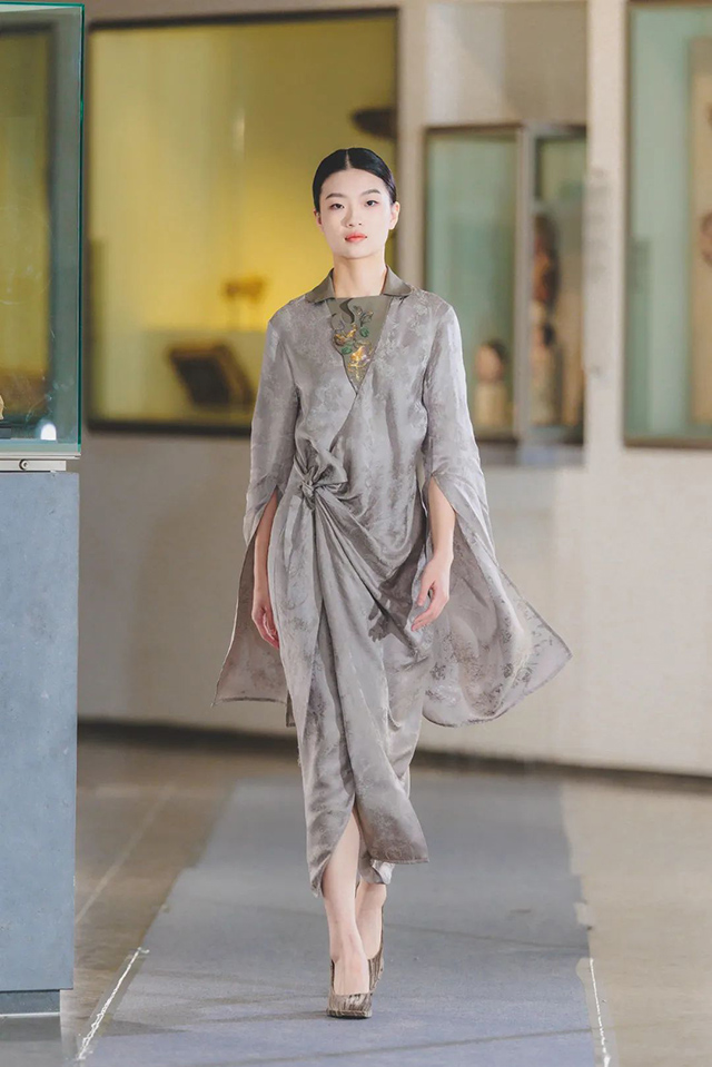 跨界共創(chuàng),是此次發(fā)布會(huì)的關(guān)鍵詞。此次發(fā)布會(huì)上,來(lái)自于法國(guó)的設(shè)計(jì)師MAYA BELIKOVA,曾擔(dān)任CHRISTIAN DIOR 和Guy Laroche多年設(shè)計(jì)師,她以“立獅寶花紋錦”為靈感源,設(shè)計(jì)了系列女裝;Mathilde Borredon曾擔(dān)任LANVIN二十年設(shè)計(jì)師,她以“翼馬紋錦”為靈感源,設(shè)計(jì)了小禮服系列;浙江理工大學(xué)服裝學(xué)院院長(zhǎng)崔榮榮教授團(tuán)隊(duì)設(shè)計(jì)了禮服系列;中國(guó)絲綢博物館館長(zhǎng)季曉芬?guī)ьI(lǐng)研究生陳伊娜、黃伊麗設(shè)計(jì)了商務(wù)女裝系列以及小禮服系列,并使用中國(guó)蠶桑絲織技藝完成了作品;季曉芬館長(zhǎng)團(tuán)隊(duì)與安踏集團(tuán)設(shè)計(jì)總監(jiān)鄭永先團(tuán)隊(duì)共創(chuàng)了“自在翼馬鞋服”系列,成為本次發(fā)布會(huì)的亮點(diǎn)之一。"翼馬紋"作為古絲綢之路文化交融的使者,其形象在“自在翼馬鞋服”系列中得到了完美詮釋,解構(gòu)、藝化運(yùn)用國(guó)絲館藏文物“翼馬紋錦”,服裝造型汲取了唐代圓領(lǐng)袍、翻領(lǐng)袍、襦裙、蹀躞等元素,鞋型汲取了唐代六合靴的鞋脊元素,舒適而富含歷史韻味。季曉芬館長(zhǎng)認(rèn)為:文物融入時(shí)尚產(chǎn)業(yè),賦美人們生活,是博物館重要使命之一!