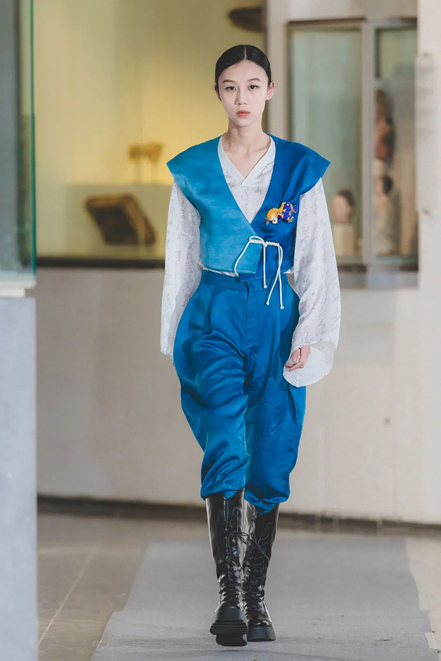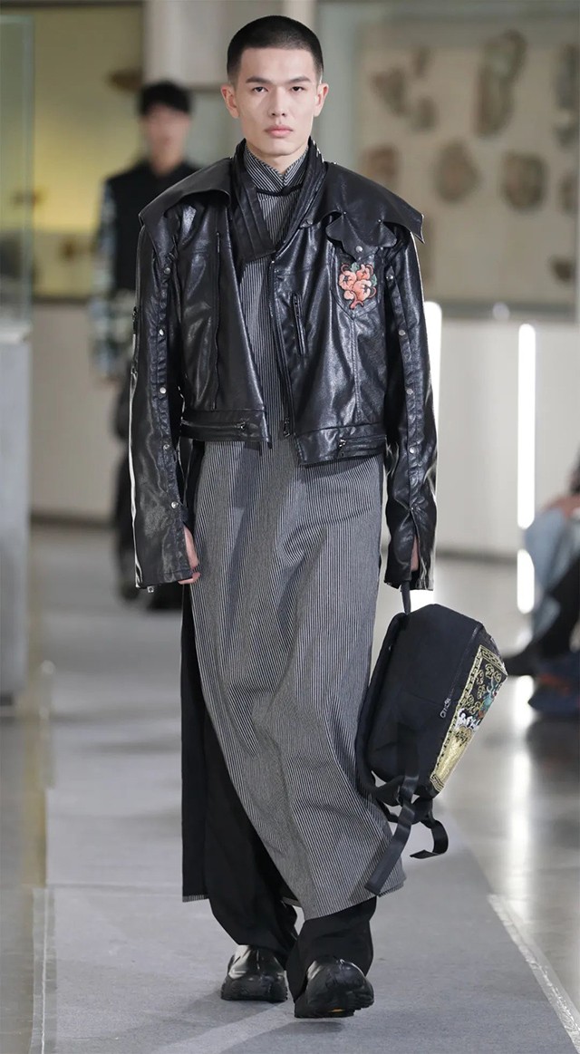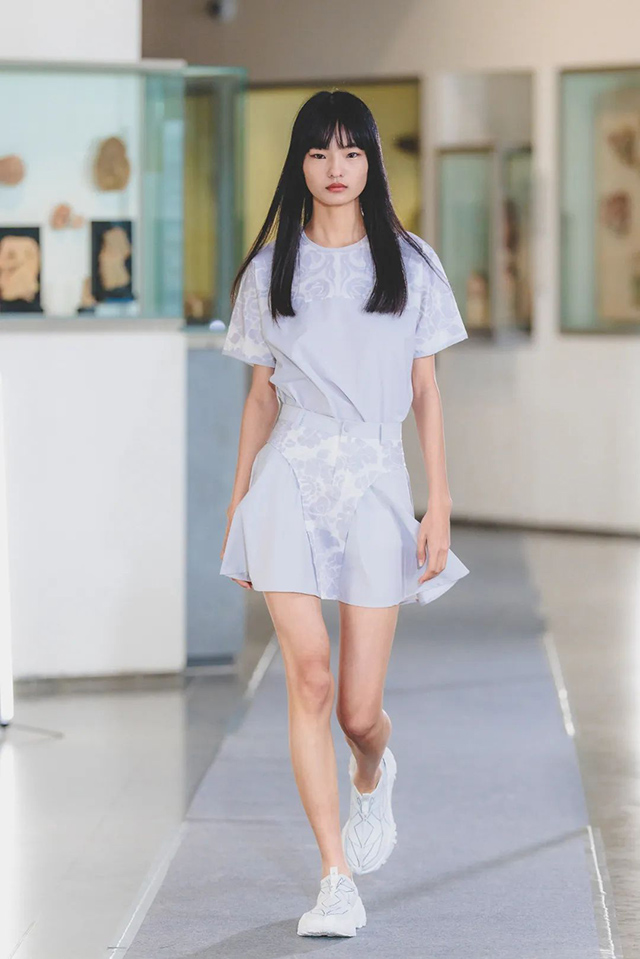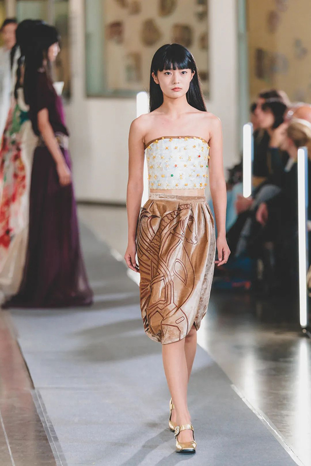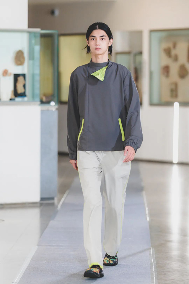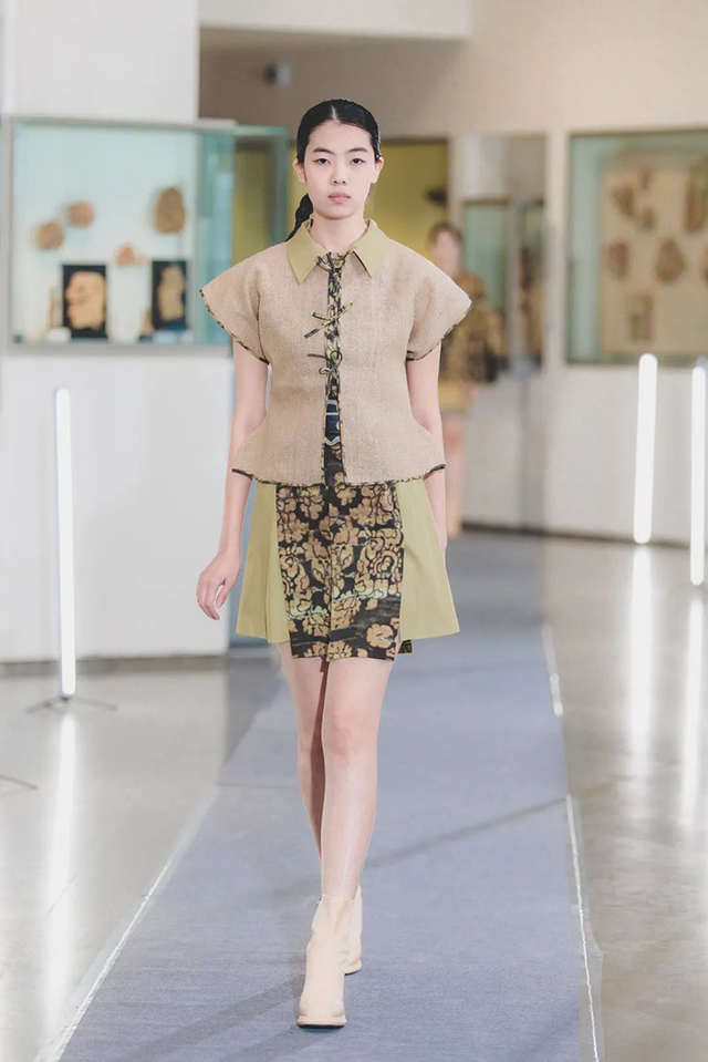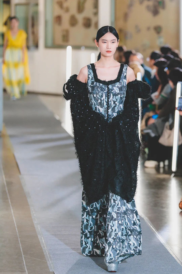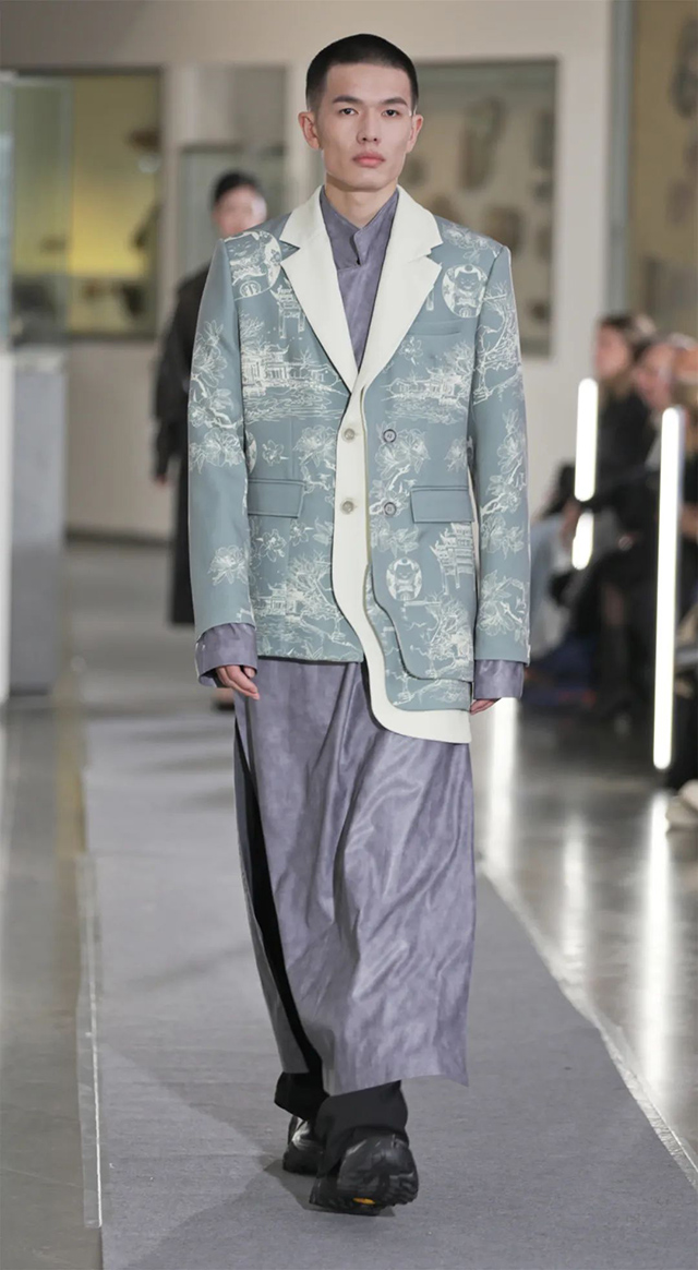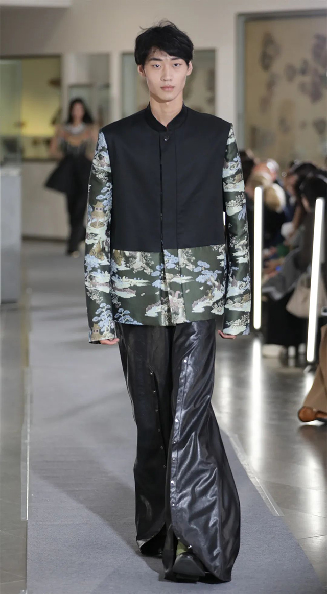 跨界共創(chuàng),是此次發(fā)布會(huì)的關(guān)鍵詞。此次發(fā)布會(huì)上,來(lái)自于法國(guó)的設(shè)計(jì)師MAYA BELIKOVA,曾擔(dān)任CHRISTIAN DIOR 和Guy Laroche多年設(shè)計(jì)師,她以“立獅寶花紋錦”為靈感源,設(shè)計(jì)了系列女裝;Mathilde Borredon曾擔(dān)任LANVIN二十年設(shè)計(jì)師,她以“翼馬紋錦”為靈感源,設(shè)計(jì)了小禮服系列;浙江理工大學(xué)服裝學(xué)院院長(zhǎng)崔榮榮教授團(tuán)隊(duì)設(shè)計(jì)了禮服系列;中國(guó)絲綢博物館館長(zhǎng)季曉芬?guī)ьI(lǐng)研究生陳伊娜、黃伊麗設(shè)計(jì)了商務(wù)女裝系列以及小禮服系列,并使用中國(guó)蠶桑絲織技藝完成了作品;季曉芬館長(zhǎng)團(tuán)隊(duì)與安踏集團(tuán)設(shè)計(jì)總監(jiān)鄭永先團(tuán)隊(duì)共創(chuàng)了“自在翼馬鞋服”系列,成為本次發(fā)布會(huì)的亮點(diǎn)之一。"翼馬紋"作為古絲綢之路文化交融的使者,其形象在“自在翼馬鞋服”系列中得到了完美詮釋,解構(gòu)、藝化運(yùn)用國(guó)絲館藏文物“翼馬紋錦”,服裝造型汲取了唐代圓領(lǐng)袍、翻領(lǐng)袍、襦裙、蹀躞等元素,鞋型汲取了唐代六合靴的鞋脊元素,舒適而富含歷史韻味。季曉芬館長(zhǎng)認(rèn)為:文物融入時(shí)尚產(chǎn)業(yè),賦美人們生活,是博物館重要使命之一!