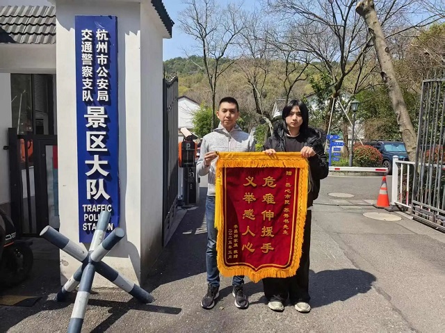 近日,來(lái)自安徽的市民李先生來(lái)到杭州市交通支隊(duì)西湖景區(qū)大隊(duì)南山中隊(duì),將寫(xiě)著“危難伸援手,義舉感人心”的錦旗送給我館社會(huì)教育部工作人員蘇秀書(shū)手上,感謝在車禍中見(jiàn)義勇為,在危難之際救助他父親的感人事跡。