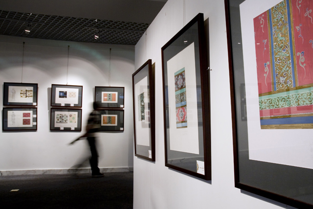 本次展覽共展出敦煌服飾和裝飾圖案臨摹作品252張,實物作品近20件。展出的實物中有常沙娜設(shè)計的絲巾、陶瓷掛盤、面料設(shè)計以及2001年為國務(wù)院設(shè)計的敦煌系列茶杯。展覽展出的大部分作品完成于1959年,當(dāng)時身為中央工藝美術(shù)學(xué)院染織系年輕教師的常沙娜、黃能馥、李綿璐利用暑假遠(yuǎn)赴敦煌莫高窟,以染織為專題摹繪收集壁畫、彩塑上所見的服飾紋樣共三百余幅。在整理過程中為了更形象地展現(xiàn)服飾紋樣的應(yīng)用情況,并請當(dāng)時還是學(xué)生身份的劉元風(fēng)、李當(dāng)歧給為整理的服飾紋樣配上統(tǒng)一的線描圖案服飾部位示意圖。另一部分作品是1999年常沙娜負(fù)責(zé)清華大學(xué)985研究課題“敦煌歷代裝飾紋樣研究課題”時,她帶領(lǐng)研究生整理的敦煌裝飾紋樣。