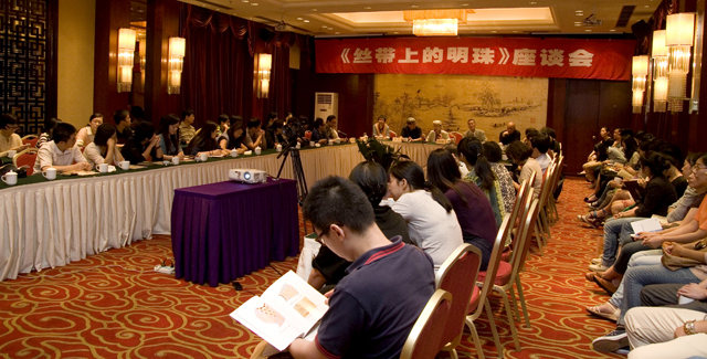 開幕式結(jié)束后,中國絲綢博物館還舉辦了“絲帶上的明珠”學(xué)術(shù)座談會,許多專家學(xué)者設(shè)計師以及敦煌愛好者到會聆聽。在會上,常沙娜敘述了她與敦煌以及新中國工藝美術(shù)設(shè)計之間的點(diǎn)點(diǎn)往事,表達(dá)了她對當(dāng)下工藝美術(shù)設(shè)計的想法。在會后,常沙娜為她的父親常書鴻自傳《九十春秋——敦煌五十年》現(xiàn)場簽名。