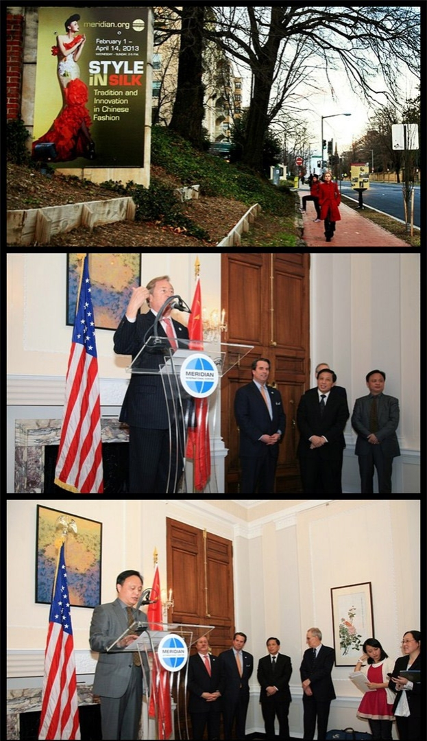 由中國商務部主辦,中國絲綢博物館和美國子午線國際中心聯(lián)合承辦的“錦繡擷英:中國絲綢藝術(shù)的歷史和時尚”展覽,作為中國駐美大使館開展的“歡樂春節(jié)”活動的重點內(nèi)容,于2013年1月31日晚在美國華盛頓美國子午線國際中心揭幕。中國駐美大使張業(yè)遂,美國子午線國際中心董事會主席、前密歇根州州長詹姆士·布蘭查德,美國子午線國際中心總裁兼首席執(zhí)行官斯圖爾特·霍利迪,中國絲綢博物館館長助理張毅出席儀式并致辭。