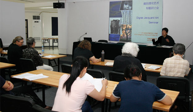 9月22日下午,2013年杭州纖維藝術(shù)三年展召開的第二天,中國絲綢博物館展區(qū)的“數(shù)碼提花藝術(shù)專題研討會”在博物館活動中心召開。這次研討會邀請到6位國際知名的紡織設(shè)計(jì)藝術(shù)大師前來講述他們的藝術(shù)創(chuàng)作歷程和對各自藝術(shù)作品的解讀。