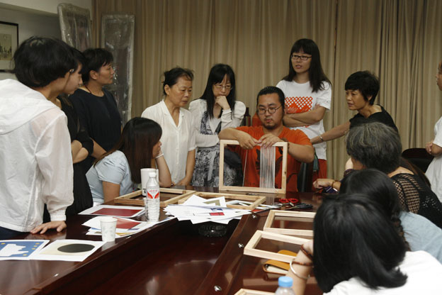 為了讓大家能學(xué)到地道的緙織工藝,中國(guó)絲綢博物館專(zhuān)門(mén)請(qǐng)來(lái)了中國(guó)美術(shù)學(xué)院雕塑系纖維與空間藝術(shù)工作室的老師們,讓他們手把手教大家體驗(yàn)古老的緙織技藝。首先由吳盛杰老師演示平針、繞針、上經(jīng)線(xiàn)、鎖邊等基本針?lè)ǎ又蠹以诶蠋焸兊闹笇?dǎo)下,選擇馬蒂斯、蒙德里安、馬列維奇等抽象風(fēng)格的繪畫(huà)進(jìn)行緙織練習(xí),也有一些學(xué)員選擇自行創(chuàng)作來(lái)體驗(yàn)這種傳統(tǒng)工藝所創(chuàng)造出的藝術(shù)效果。