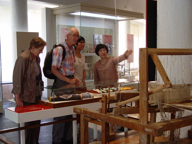 隨后,蔡琴書記陪同嘉賓參觀我館的陳列展覽,特別向他們介紹去年新展示的“天蠶靈機(jī)——中國蠶桑絲織技藝非物質(zhì)文化遺產(chǎn)展”,展覽內(nèi)容使得他們對傳統(tǒng)的蠶桑絲織工藝流程產(chǎn)生了濃厚興趣,提出了許多問題,并且也希望我館能夠提供一些圖片資料以便充實里昂的展覽。