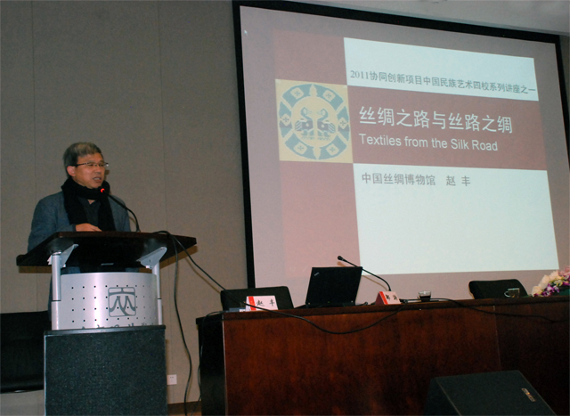 聘書頒發(fā)儀式之后,應(yīng)“2011協(xié)同創(chuàng)新”項目之邀,趙豐館長并在北服作了題為“絲綢之路與絲路之綢”的講座。此講座是“中國民族藝術(shù)教育聯(lián)盟”四校系列講座之一,也是北服“科學(xué)·藝術(shù)·時尚節(jié)”的重要內(nèi)容。趙豐館長的講座以草原絲路、沙漠綠洲絲路、海上絲路三條絲綢之路上的考古發(fā)現(xiàn)為中心展開論述。從草原絲路巴澤雷克墓地出土的紡織品,到沙漠絲路樓蘭地區(qū)考古發(fā)現(xiàn)的絲織品,再到海上絲路貿(mào)易中流行的天鵝絨與大洋花,趙豐館長以其嚴謹?shù)氖妨虾拓S富的圖片,介紹了不同時間和空間絲綢之路上絲織品的概況。趙豐館長以其深厚的學(xué)術(shù)功底和深入淺出的演講風(fēng)格,使在場的北服師生深切感受了中國古時絲綢貿(mào)易的繁榮及其在中外經(jīng)濟文化交流中所起的作用,講座取得了很好的效果。