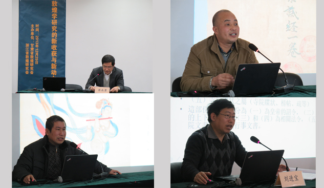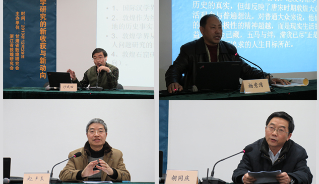會上,來自甘肅省敦煌研究會和浙江省敦煌研究會的7位專家學者作了報告。甘肅省敦煌研究會趙聲良作的“近年來敦煌藝術(shù)研究”,結(jié)合佛教史背景特別是佛教儀軌對敦煌石窟藝術(shù)進行了深入的探討;甘肅省敦煌研究會胡同慶作的“具象、實用——敦煌美學研究的發(fā)展方向”對敦煌整體藝術(shù)、壁畫、服飾、樂舞、文學、書法等眾多方面介紹了敦煌藝術(shù)研究近年來的狀況;甘肅省敦煌研究會沙武田作的“敦煌石窟粟特美術(shù)研究”,對粟特研究作了簡要的介紹,并結(jié)合學界研究成果對敦煌洞窟中的粟特供養(yǎng)人作了研究;甘肅省敦煌研究會楊秀清作的“中古時期大眾思想史研究的幾個問題——以唐宋敦煌地區(qū)為中心”,以敦煌文書為中心對唐宋時期敦煌地區(qū)的大眾思想作了概述;浙江省敦煌研究會劉進寶作的“敦煌史部文獻整理研究”,對正在進行的《敦煌史部文獻合集》編纂工作作了詳細的介紹;浙江省敦煌研究會毛建波作的“中國美術(shù)學院龜茲壁畫臨摹研究計劃”,則針對中國美術(shù)學院的龜茲壁畫臨摹研究計劃作了介紹;浙江省敦煌研究會朱大星所作的“敦煌道經(jīng)略論”,則以敦煌文書為中心,詳細介紹了敦煌當?shù)氐牡澜探?jīng)典,深化了對敦煌地區(qū)宗教多樣化的認識。