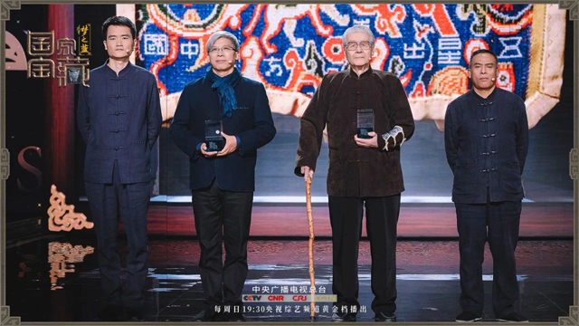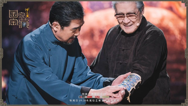 參加國家寶藏節(jié)目錄制之時,我們利用復(fù)制成功的五星錦原樣仿制了最初的五星錦護(hù)膊,節(jié)目中綁在了此件國寶守護(hù)人藍(lán)天野先生的手臂上展示。
