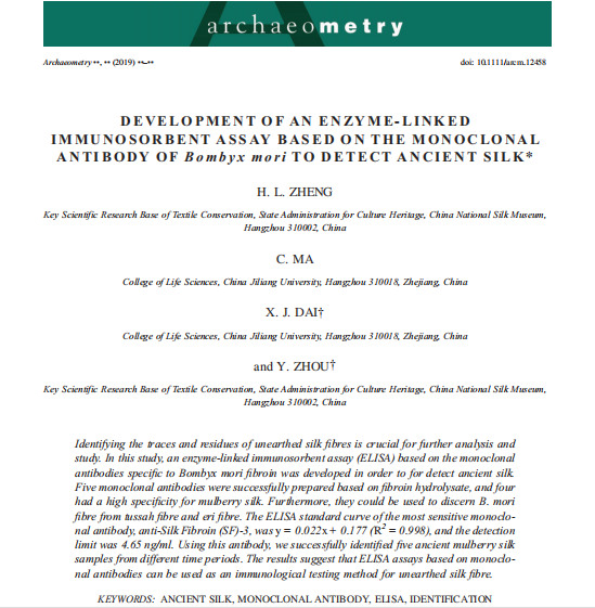 2019年,紡織品文物保護(hù)國家文物局重點(diǎn)科研基地(中國絲綢博物館)纖維研究團(tuán)隊(duì)聯(lián)合中國計(jì)量大學(xué)在國際期刊 Archaeometry(《定量考古學(xué)》)上發(fā)表有關(guān)利用酶聯(lián)免疫方法鑒定古代絲綢纖維材質(zhì)的論文,中國絲綢博物館鄭海玲為第一作者。