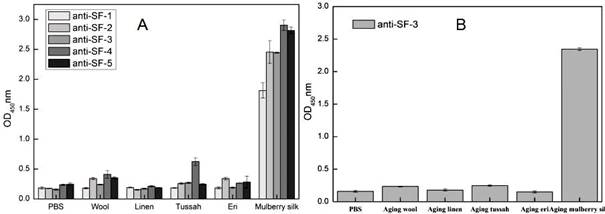 為了克服抗體與樣品非特異性結(jié)合,研究者利用絲素蛋白水解液制備出針對(duì)桑蠶絲的幾種單克隆抗體,通過對(duì)每種單克隆抗體的效價(jià)評(píng)估,遴選出效價(jià)高特異性強(qiáng)的單克隆抗體 anti-SF-3,該抗體不僅能夠有效地將桑蠶絲與羊毛、麻纖維區(qū)別開來,而且能將桑蠶絲從柞蠶絲、蓖麻蠶絲等野蠶絲中區(qū)分出來。利用該抗體對(duì)不同時(shí)期的五個(gè)文物樣進(jìn)行了種屬鑒定,確定五個(gè)文物樣均為桑蠶絲。這表明基于單克隆抗體的ELISA方法在蠶絲種屬鑒定研究中的有效性和可行性,這為古代絲織品文物種屬鑒定提供了新方法。