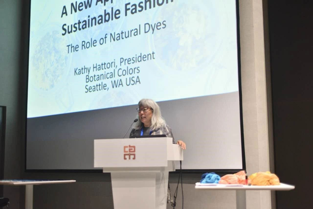 Katherine Hattori的報(bào)告題為《美國(guó)“慢時(shí)尚”中天然染料生產(chǎn)到染色》,以自己創(chuàng)辦植物色彩公司的實(shí)踐為例,介紹如何向客戶提供清晰的生產(chǎn)鏈、染料和制造工藝