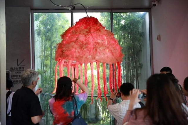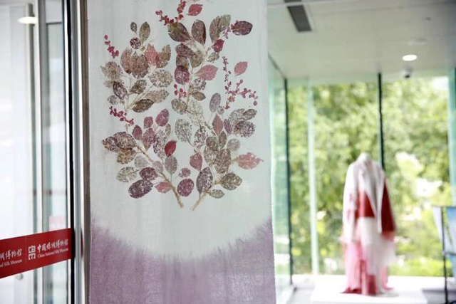 據(jù)參與展覽策劃工作的國(guó)絲館工作人員介紹,此次展覽注重突出展品本身,設(shè)計(jì)風(fēng)格主打簡(jiǎn)約。為了增強(qiáng)觀眾身臨其境的參與感,在空間設(shè)計(jì)上,此次展覽沒有局限在固定展廳。策展方在館內(nèi)多功能廳、時(shí)裝館、飄帶連廊、甚至戶外都擺放了展品,觀眾可以隨時(shí)隨地欣賞藝術(shù)作品,感受天然染料在當(dāng)代藝術(shù)領(lǐng)域的新應(yīng)用。而置身其中的氛圍營(yíng)造,也增加了觀眾了解展品內(nèi)涵的興趣。