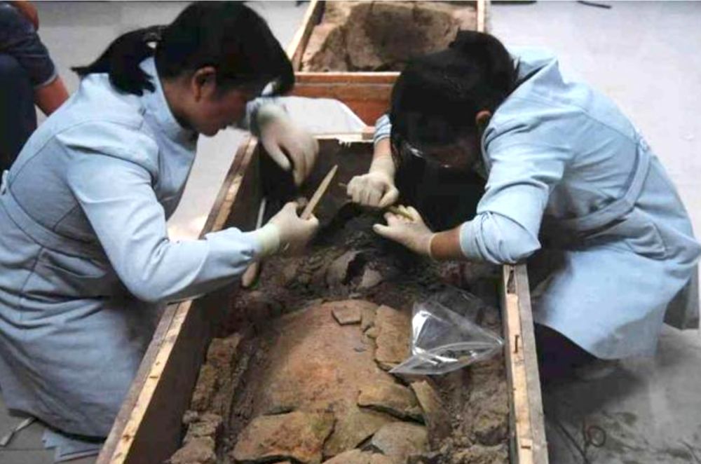 這是科研人員從甕棺中取樣的現(xiàn)場(chǎng)。受訪者供圖