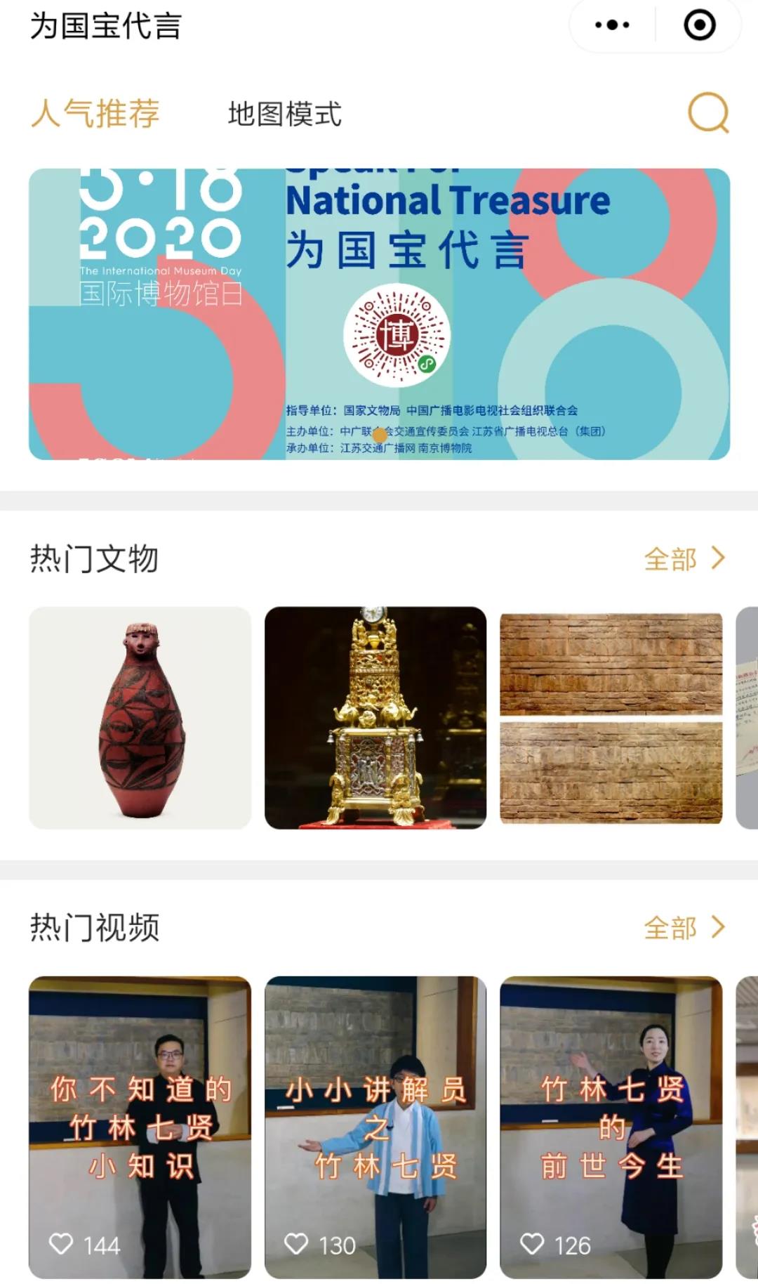 在2019年的“我為國寶點贊”小程序基礎上,由國家文物局指導,中廣聯(lián)合會交通宣傳委員會、江蘇省廣播電視臺聯(lián)合多家博物館開展的“百城、百臺、百人、百物 為國寶代言”項目啟動,觀眾可以通過搜索關注“為國寶代言”小程序參與該項活動,為線下的博物館之旅做足功課。