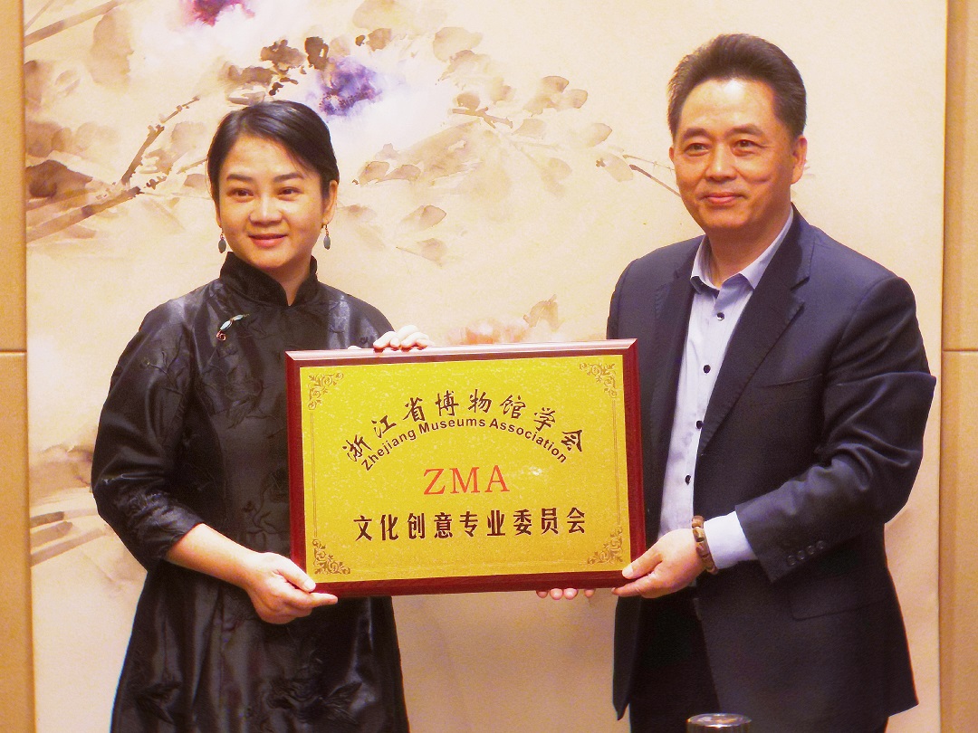 浙江省博物館學會理事長嚴洪明(右)向文創(chuàng)專委會主任委員周旸(左)授牌