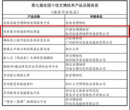 9月26日,由中國(guó)文物報(bào)社、文物保護(hù)裝備產(chǎn)業(yè)化及應(yīng)用協(xié)同工作平臺(tái)、三峽文物科技保護(hù)基地聯(lián)合主辦的第七屆全國(guó)十佳文博技術(shù)產(chǎn)品及服務(wù)推介活動(dòng)終評(píng)會(huì)在深圳舉辦。本屆推介活動(dòng)于2021年5月啟動(dòng),共有80多家文博機(jī)構(gòu)、科研院所及相關(guān)企業(yè)申報(bào),64個(gè)技術(shù)產(chǎn)品及服務(wù)項(xiàng)目獲得參評(píng)資格。經(jīng)過(guò)終評(píng)匯報(bào)、專家評(píng)選,中國(guó)絲綢博物館、杭州標(biāo)普新材料科技有限公司參評(píng)的“絲素蛋白快速檢測(cè)試劑盒”榮獲“第七屆全國(guó)十佳文博技術(shù)產(chǎn)品及服務(wù)獎(jiǎng)”。