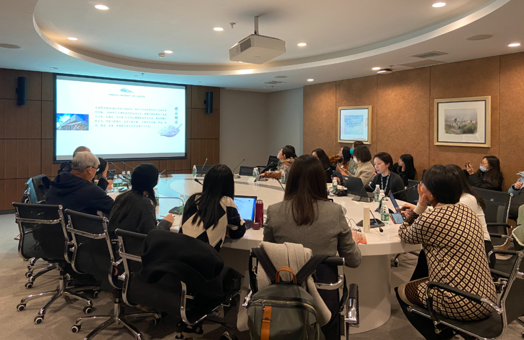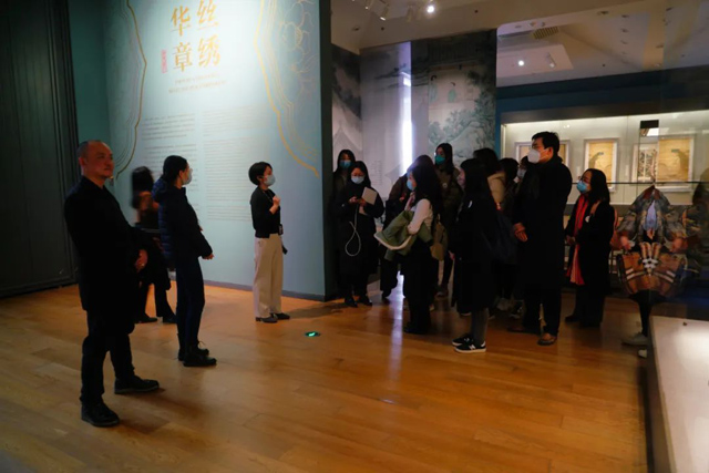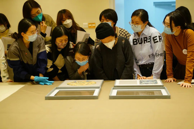 參觀《清華藏珍·絲繡華章》展覽,典藏部倪葭主任、高文靜老師導覽;觀摩藕荷暗花綢地平金繡花卉紋百褶魚鱗裙等藏品共9件/套,高文靜老師、趙豐主任作講解;倪葭主任作題為《清華大學藝術(shù)博物館織繡藏品擷英》的講座;學員們交流各自所在博物館的紡織服飾業(yè)務,學術(shù)研究,策展經(jīng)驗,研修心得等。