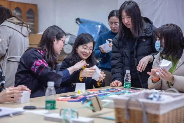 參觀織錦刺繡蠟染廳、漢族服飾廳、苗族服飾廳等展廳的基本陳列和臨展,賀陽教授、高丹丹老師、謝菲老師共同導覽;賀陽教授分享田野調(diào)查的所見所感及對傳統(tǒng)造物理念“慎術(shù)”和“節(jié)用”的深刻理解和設(shè)計應用等;體驗傳統(tǒng)折紙針線包的制作;觀摩民族服飾和歷代服飾共10件/套,賀陽教授、趙豐主任作講解。