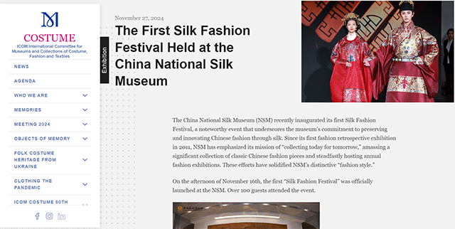讓文物活起來,讓生活更美好。11月16日下午,首屆“絲尚盛典”在中國絲綢博物館正式啟動,其推出的豐富活動被國際博物館協(xié)會服裝專委會(ICOM-COSTUME)官網(wǎng)轉(zhuǎn)載報道。