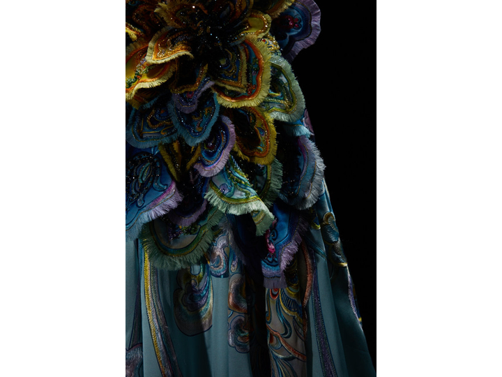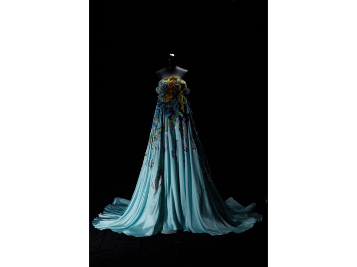 在勞倫斯·許眼里,杭州是“絲綢之府”,這件以絲綢云錦為面料,圍繞敦煌元素設(shè)計(jì)而成的作品,以唐代的花紋色彩擴(kuò)展形成,服裝色彩主要以淡藍(lán)向金色漸變,胸前就像一朵絢爛的絲綢之花,就像美麗的飛天裙擺,一曲敦煌飛天、一縷蝶舞迷香,意在用絲綢連接古今中外的世界文明從遠(yuǎn)古走來,時(shí)間仿佛穿越到千年前,人們流連于大漠石窟,觸摸著斑駁而璀璨的歷史,讓絲綢文化與敦煌藝術(shù)碰撞出火花,具有了中國氣派和民族風(fēng)格。