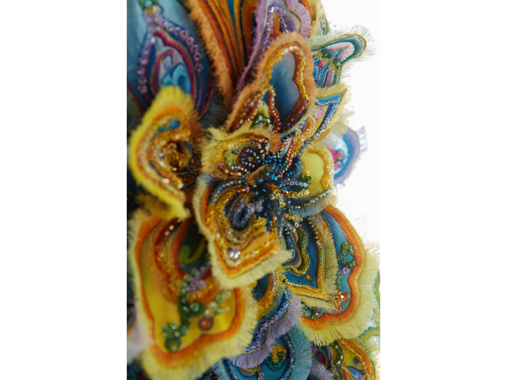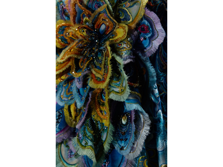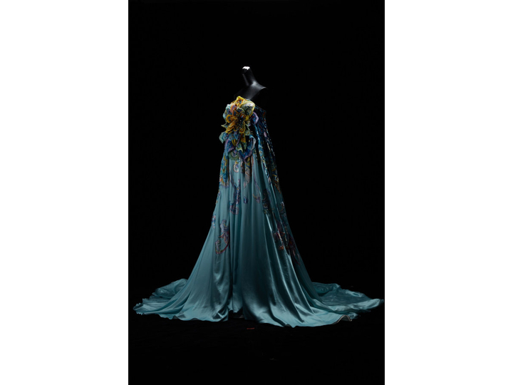 光束下,面對(duì)作品,想象這件以敦煌為靈感的華服霓裳的敦煌飛天,輕盈飄逸地從天而降,一幅古代中西文化交流的畫卷,漸次舒展開來。眼前,這件《敦煌》華服是我國著名服裝設(shè)計(jì)師勞倫斯·許的最新代表作。