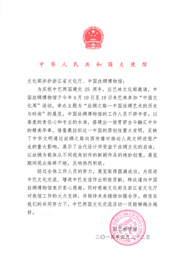 Sponsored by Ministry of Culture of the People’s Republic of China, Ministry of Culture of the Kingdom of Bahrain, Embassy of the People’s Republic of China in the Kingdom of Bahrain, and organized by Zhejiang Provincial Department of Culture, a special exhibition “The Silk Road: History and Fashion of Chinese Silk” is held in the Kingdom of Bahrain from April 10 to April 19, 2014. As part of “Chinese Culture Week”, this exhibition is popular among local people greatly and highly appreciated. Therefore, Embassy of the People’s Republic of China in the Kingdom of Bahrain sends a letter of acknowledgement to China National Silk Museum for their creativity and hard work.