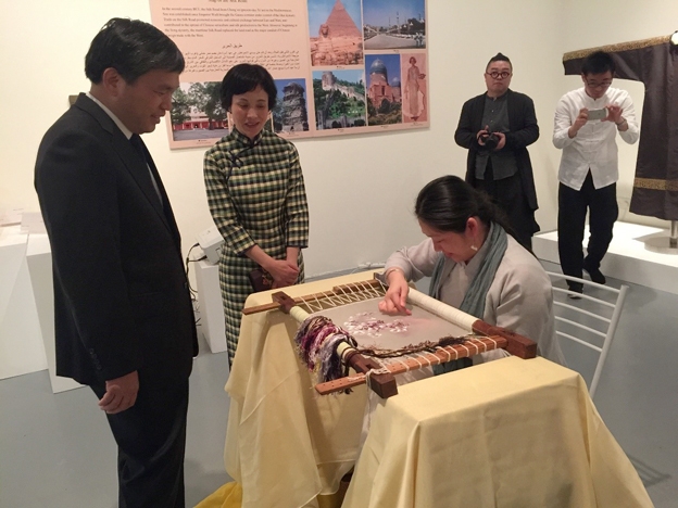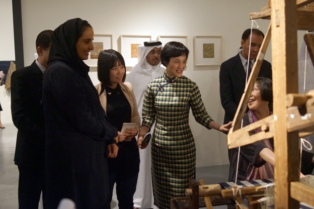 Princess Sheikha Al-Mayassa, accompanied by other VIP Qatari guests, was present at the opening ceremony along with the Chinese ambassador to Qatar Li Sheng, Head Commissioner of the Culture Department of Zhejiang Province Jin Xing Sheng,Head Office Manager of the Culture Department of Zhejiang Province Hu ChaoDong, and the Head of the Foreign Commission of the Culture Department of Zhejiang Province. Princess Mayassa cut the ribbon of the exhibition at the Qatar Museum, and, under the guidance of curator and researcher Xue Yan of China National Silk Museum, toured the entire exhibition. To bestow the opening ceremony with more Chinese characteristics, China invited renowned Chinese Embroidery artist Jin JiaHong, who had dedicated more than 20 years of his life to this art form, to perform traditional Chinese embroidering live. At the same time, researcher Lou Shuqi of China National Silk Museum was also performing silk weaving using a traditional loom. The exhibition received high praise from the princess, who later said that Qatar will strengthen its ties and continue to engage in cultural exchange with China.