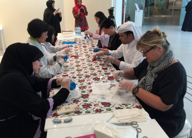 In coordination with the exhibition, curator Xue Yan gave a lecture on “the Chinese Silk on the Silk Road—using examples fromclothing in the 10-14th centuries” at the Museum of Islamic Art, at 3 pm on March 21st. In it, she discussed silk fashion across the centuries in China,the relationship between clothing and human relationships, and some similarities in clothing between the Chinese and Arabs. On March 24, the curatorial team also unveiled two craftsmanship workshops, one at 10:30 am and one at 4:30 pm, and invited locals to partake in, and experience the millennium-old Chinese resist-dyeing technique, in hopes that these workshops will deepen their interest in Chinese culture.