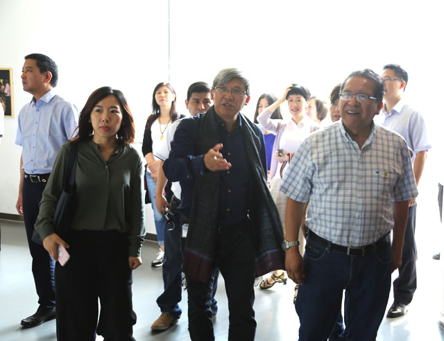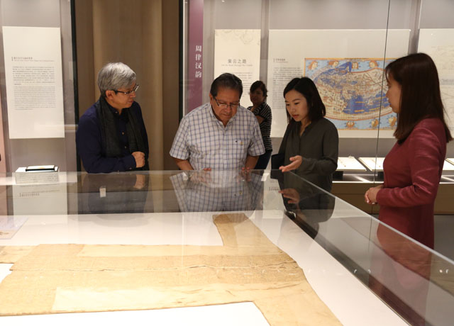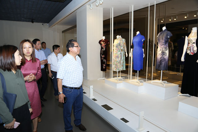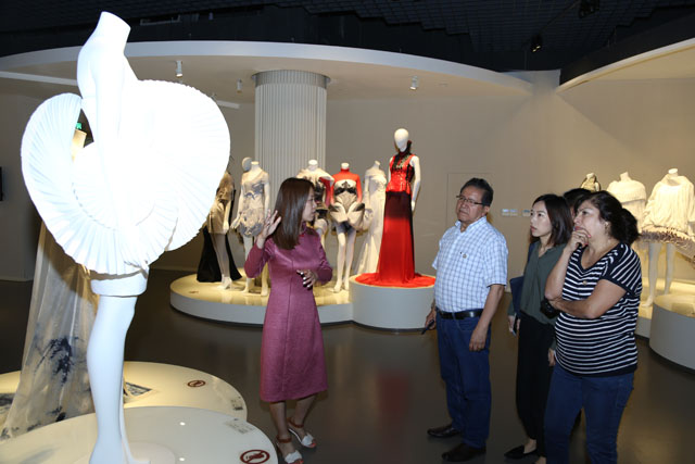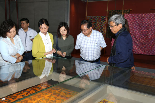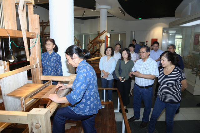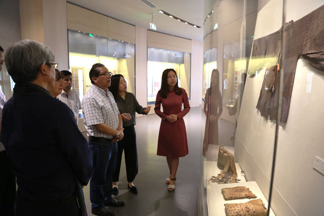 The partyvisited Silk Road Gallery, Weaving Gallery, Fashion Galleryand Brocade Cafe. In the FashionGallery, they visitedthe temporary exhibition Brocade andEmbroidery Culture of Zhuang Nationality in Guangxi. Dr, Zhao Feng,the Museum Director, made a specificguide tour.