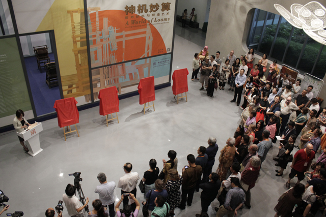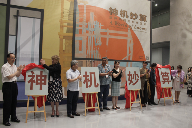 Ning Qiaoen, consul general of Indonesia in Shanghai, Liu He, director of the Zhejiang Municipal Administration of Culture Heritage, Cao Hong, deputy director of the Zhejiang Municipal Administration of Culture Heritage, Rasul Mirzaahmedov, official of the United Nations Educational, Scientific and Cultural Organization (UNESCO) Office in Tashkent, Uzbekistan, and Chen'an, deputy director of Department of Foreign and Overseas Chinese Affairs of Zhejiang, Dr. Eva Strand, associate professor and director of Textile Research Center of University of Copenhagen in Denmark, Zhang Baochun, director of the Institute of the History of Natural Science of Chinese Academy of Sciences, and Andrée Etheve, curator of the FEM Museum of Madagascar unveiled "A World of Looms: Weaving Technology and Textile Arts in China and Beyond" Exhibition.