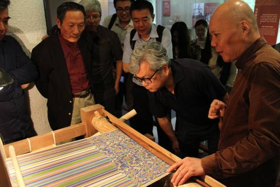 On the morning of May 20, 2018, the interim report of "wu xing chu dong fang li zhong guo" Han jin-silk (hereinafter referred to as "wu xing" jin-silk) restoration project was held in the International Center of China National Silk Museum (hereinafter referred to as NSM). Luo Jing and other leaders from the State Administration of Cultural Heritage, Liu he and Cao Hong, the director and the deputy director of the Zhejiang Municipal Administration of Culture Heritage, Li Jun, the deputy director of the cultural heritage bureau of Xinjiang Uygur Autonomous region, Qi Dongfang, the professor of the school of Archaeology and Museology of Peking University, and the member of the Niya Archaeological team, attended the meeting. This meeting was hosted by Zhou yang, assistant curator of NSM. The project executor, Luo Qun, demonstrated the weaving process. The curator of NSM Zhao Feng introduced the research process of "wu xing" jin-silk restoration project from three aspects: first, unearthed and studied the "wu xing" jin-silk, second, unearthed and studied the Laoguanshan loom, and third, used the research results of Laoguanshan loom to replicate "wu xing" jin-silk. It was the original technology restoration that Han loom woven Han jin-silk. Experts highly praised the replication work of "wu xing" jin-silk, and believed that this replication has been successful.
