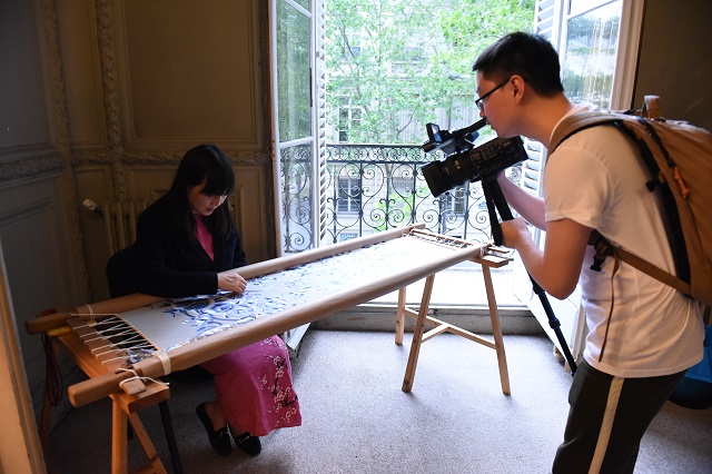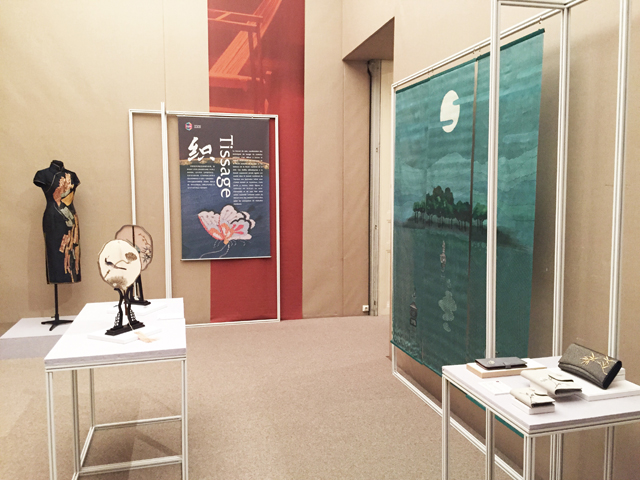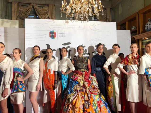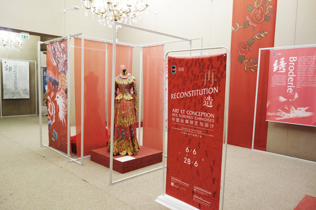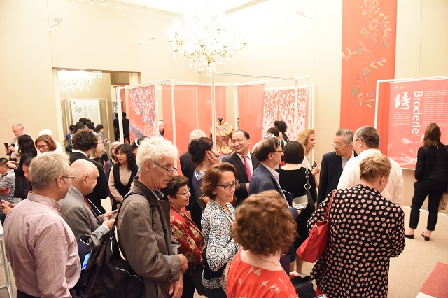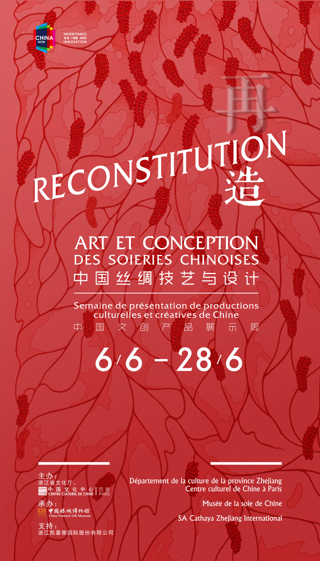 On the evening of June 5th, “Reconstitution: Art and Conception of Chinese Silks”exhibition which was hosted by the Cultural Center of China in Paris (hereinafter referred to as the “center”) and the Zhejiang Provincial Department of Culture, and also was organized by China National Silk Museum, opened at the Cultural Center of China in Paris. The directer of center, Yan Zhenquan and more than 100 guests from all walks of life attended the opening ceremony.