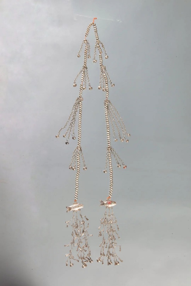 A set of intricate silver pedants adorning a dress is also on display. Local craftsmen engraved fish, crab, frog and bird patterns on silver accessories.