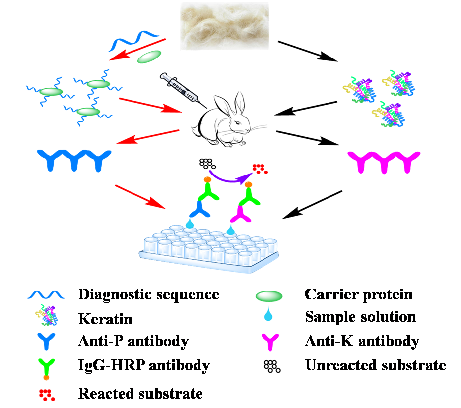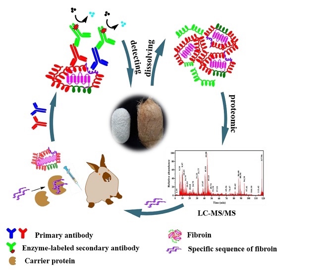 Through proteomic analysis, the team obtained the diagnostic sequences of silk fibroin an/d keratin of different biological species. Polyclonal antibody an/d monoclonal antibody of silk fibroin an/d keratin were prepared by animal immunization with high sensitivity an/d specificity. Through enzyme linked immunosorbent assay, immunofluorescence microscopy, Western blot, electrochemical immunosensor an/d other methods, the detection system of textile cultural relics was constructed an/d the limit of detection could reach 10-12 g/mL. Moreover, Colloidal gold immunochromatographic assay strip an/d time-resolved fluorescence immunochromatographic assay strip were developed an/d successfully applied in archaeological sites, which firstly provided a sensitive, specific an/d fast identification method for finding invisible ancient textile residues.
