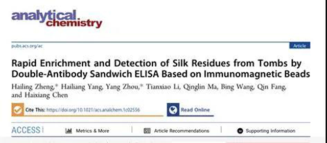 “Rapid Enrichment an/d Detection of Silk Residues from Tombs by Double-Antibody San/dwich ELISA Based on Immunomagnetic Beads”was issued on Analytical Chemistry by CNSM research team.Corresponding author & First author were Zhou Yang & Zheng Hailing fr/om CNSM. Cooperative authorities an/d universities were Zhejiang Sci-Tech University, Shandong University Cultural Heritage Research Institute an/d Hubei Provincial Museum.