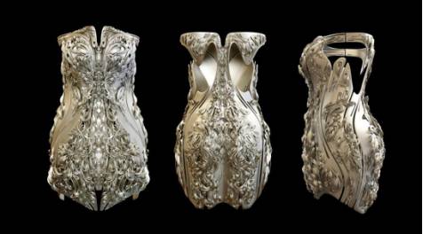 來自“極致盛放”的“侵天篇·3D打印婚紗”令人眼前一亮,作品源自數(shù)字雕塑主義的靈感,經過“人體掃描”“基于人體數(shù)據(jù)建?!薄拜敵瞿P汀薄?D打印”等制作工序,真正做到了數(shù)字時代的“量體裁衣”。材料為熱塑性聚氨酯彈性體(簡稱TPU),具有卓越的高張力、高拉力、強韌和耐老化的特性,是一種成熟的環(huán)保材料,能使婚紗可以縱向和橫向拉伸,讓穿著者感覺更加輕便舒適。