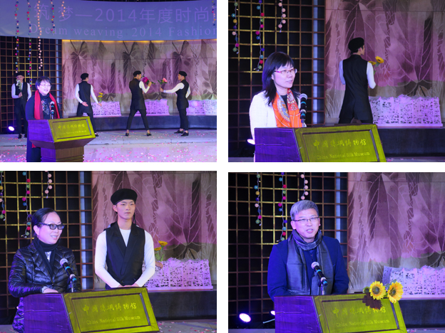 由中國(guó)服裝設(shè)計(jì)師協(xié)會(huì)、國(guó)家紡織產(chǎn)品開發(fā)中心主辦,中國(guó)絲綢博物館承辦的“筑夢(mèng)——2014年度時(shí)尚回顧展”,于2015年1月16日下午17點(diǎn)在中國(guó)絲綢博物館開幕。出席開幕式的領(lǐng)導(dǎo)和嘉賓有:國(guó)家紡織產(chǎn)品開發(fā)中心主任李斌紅,中國(guó)服裝設(shè)計(jì)師協(xié)會(huì)副主席、中國(guó)美術(shù)學(xué)院設(shè)計(jì)藝術(shù)學(xué)院院長(zhǎng)吳海燕,河南博物院院長(zhǎng)田凱,東華大學(xué)教授、上海紡織服飾博物館館長(zhǎng)卞向陽(yáng),2014“金頂獎(jiǎng)”設(shè)計(jì)師潘怡良、2014最佳男裝設(shè)計(jì)師劉勇等設(shè)計(jì)師和紡織企業(yè)代表。開幕式以杭州歌劇舞劇院獻(xiàn)上的《筑夢(mèng)》主題歌舞劇表演拉開序幕。由中國(guó)絲綢博物館黨支部副書記蔡琴主持,國(guó)家紡織產(chǎn)品開發(fā)中心主任李斌紅、中國(guó)服裝設(shè)計(jì)師協(xié)會(huì)副主席吳海燕、中國(guó)絲綢博物館館長(zhǎng)趙豐致辭,并為捐贈(zèng)作品的設(shè)計(jì)師和紡織企業(yè)代表頒發(fā)收藏證書。