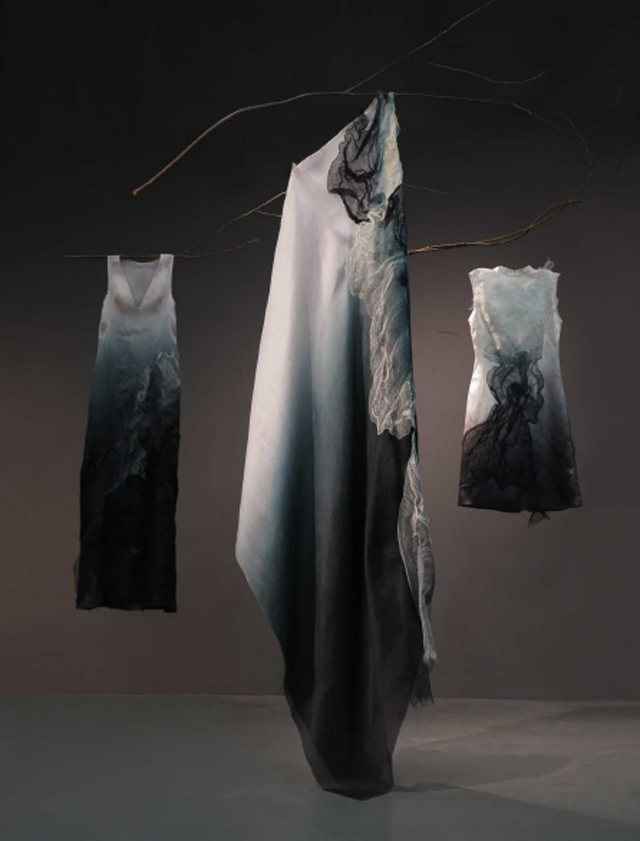 ●李薇:30多年以來,我一直在持續(xù)創(chuàng)作。創(chuàng)作過程實(shí)際是一個(gè)人的成長、成熟過程,也是尋找、發(fā)現(xiàn)、研究所創(chuàng)作載體的過程。最初通過參加設(shè)計(jì)大賽如大連杯、新西蘭羊毛杯、漢帛杯等,我更多積累的是對(duì)材料的認(rèn)識(shí)。如今,我的作品設(shè)計(jì)手法呈現(xiàn)實(shí)際都源于之前一點(diǎn)一滴的積累。在我的創(chuàng)作里一直是從中國傳統(tǒng)文化中得到靈感元素,同時(shí)又受到很多藝術(shù)家朋友的影響,我對(duì)中國畫水墨題材情有獨(dú)鐘。于是對(duì)能夠體現(xiàn)這種藝術(shù)形式的材料和手法越來越著迷,就去玩中國的絲綢。當(dāng)綃這種材質(zhì)在市場上還沒有出現(xiàn)的時(shí)候,我已經(jīng)玩了好幾百米了,等大家開始對(duì)綃有所了解時(shí),我又在尋找新的材料。你看國外大師,他們的成功或作品風(fēng)格呈現(xiàn),實(shí)際也源于材料。因?yàn)椴牧鲜怯星楦械?,有屬性的,它也有特性,就跟孩子一樣是有脾氣的,你要去把握它。那么在互?dòng)過程當(dāng)中,我越來越找到了這些材料的(特質(zhì)),把我心中對(duì)水墨的情結(jié)完美地表達(dá)出來。