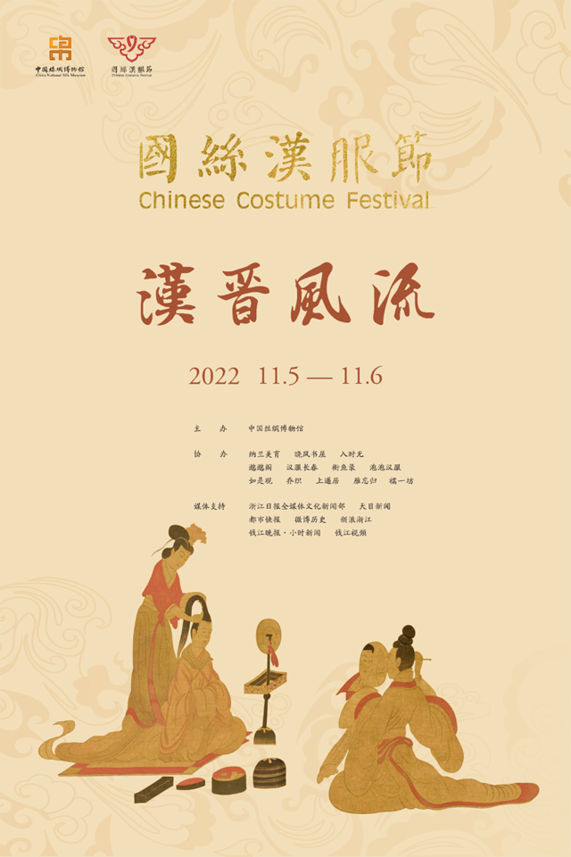 為更好地利用中國絲綢博物館收藏的古代服飾資源,為廣大公眾提供學(xué)習(xí)、鑒賞和交流平臺(tái),踐行“讓文物活起來,讓生活更美好”的理念,2022年11月5日-6日,中國絲綢博物館舉辦了第五屆“國絲漢服節(jié)·漢晉風(fēng)流”,本次國絲漢服節(jié)包括展廳導(dǎo)覽、專題講座、文物鑒賞、漢服之夜、銀瀚論道等活動(dòng),同時(shí)還有設(shè)置手工藝集市、竹林七賢打卡互動(dòng)、前世·今生:國產(chǎn)植物染料”主題分享會(huì)等活動(dòng),更與中法文化交流木瓜協(xié)會(huì)聯(lián)動(dòng),推出杭州—巴黎“雙城漢服節(jié)”活動(dòng),增強(qiáng)中華文化影響力、傳播力。