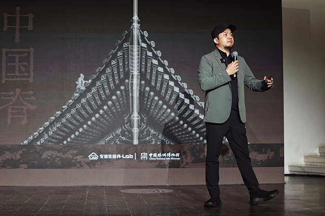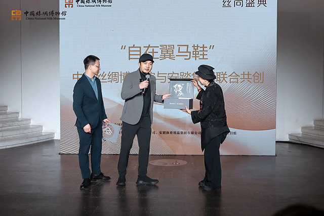 中國絲綢博物館張成名副館長與安踏集團高級總監(jiān)鄭永先共同開啟發(fā)布儀式,兩位邀請中央美術(shù)學(xué)院呂越教授作為第一位雅士上臺贈予其翼馬鞋。呂越教授如此評價“穿翼馬鞋,走新絲路,舒適自在”。
