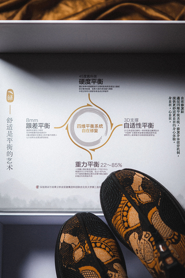 鄭永先介紹了自在翼馬鞋傳承與創(chuàng)新的設(shè)計理念:傳承三項中國文化和創(chuàng)立四維平衡科技;“中國脊”造型理念從中國傳統(tǒng)建筑的屋脊吸取靈感,“翼馬紋”承自唐代織錦,結(jié)合從河姆渡時期傳承已有七八千年歷史的大漆工藝,金箔入漆,用現(xiàn)代科技的方式重新去演繹呈現(xiàn)開放包容的中華文化精神。