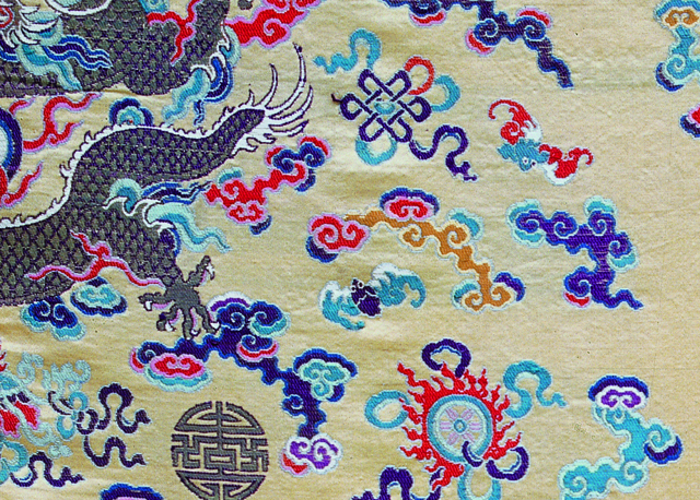 江南三織造是清代在江寧(今南京)、蘇州和杭州三處設(shè)立的專(zhuān)門(mén)織造宮廷御用和官用的各類(lèi)紡織品的織造局。浙江省博物館收藏有一件機(jī)頭上有“杭州織造臣盛桂”款的清鵝黃妝花緞龍袍袍料,在袍料中,蝙蝠與龍紋、云紋、暗八仙紋和團(tuán)壽紋等吉祥紋樣同時(shí)出現(xiàn),這說(shuō)明人們把蝙蝠一同看作為多壽、多福、多吉祥的生物。